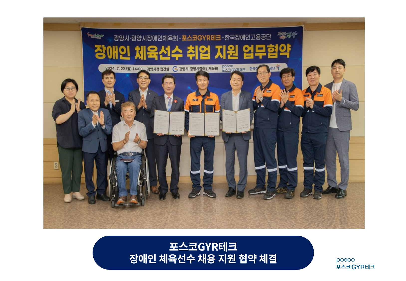 지난 22일, 광양시와 포스코GYR테크(대표이사 : 이찬기), 한국장애인고용공단 전남지사가 장애인 체육선수 채용을 위한 협약을 맺었다.