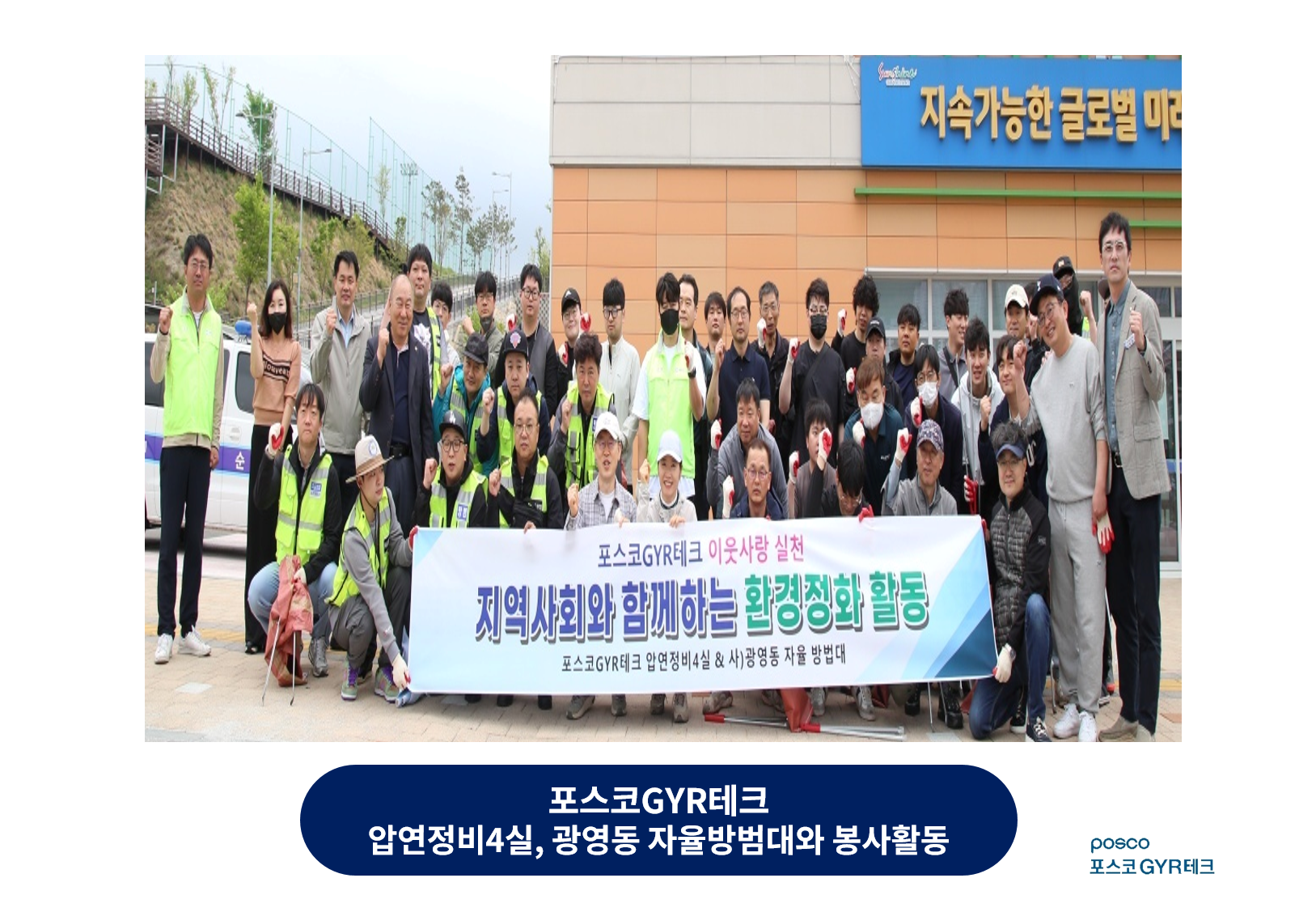 포스코GYR테크(대표이사 : 정훤우) 압연정비4실이 지난 4월 19일 토요일 광영동 자율방범대와 함께 환경정화 봉사활동을 실시하였다.