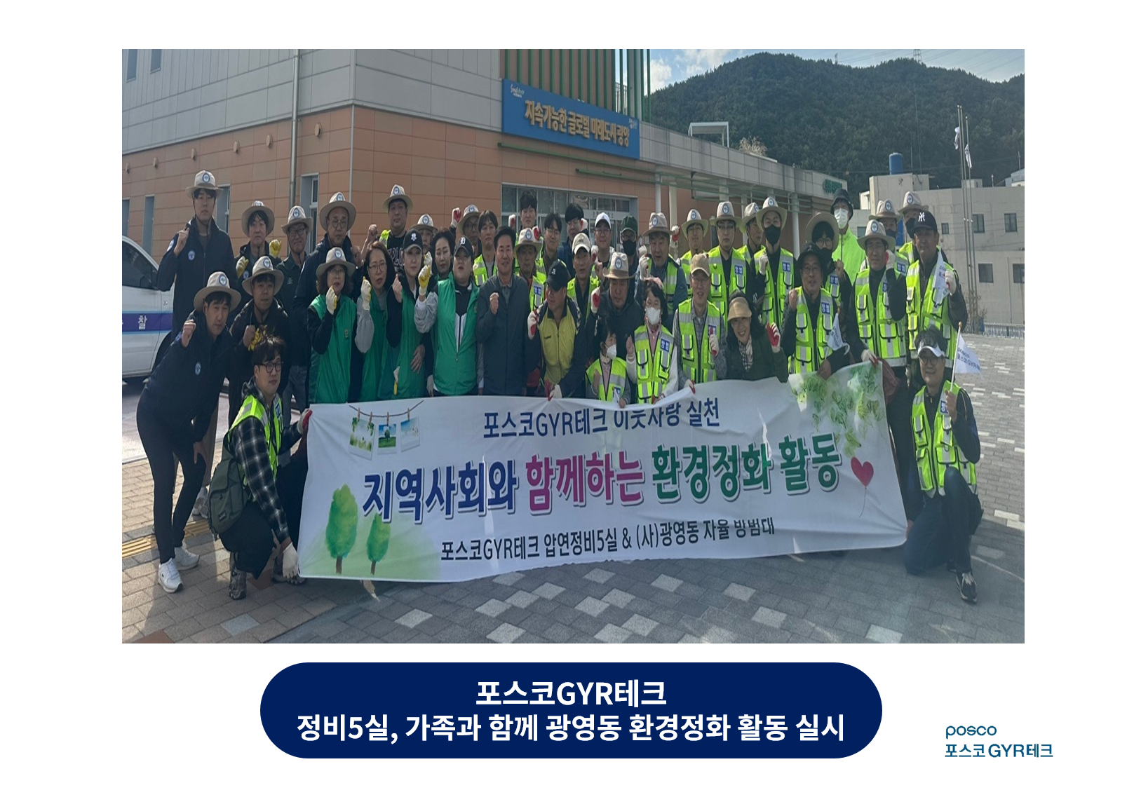 포스코GYR테크(대표이사 : 이찬기) 압연정비5실 직원 및 가족들은 지난 10월 20일(일), 광영동 자율방범대(대장 신대수), 광영동 새마을 부녀회(회장 안영숙)와 함께 광영동사무소 일대에서 환경정화 활동을 펼쳤다.