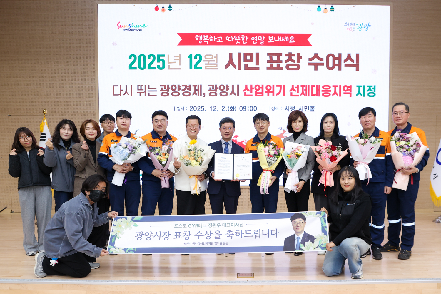 이번 시민표창은 중마장애인복지관을 비롯한 지역 복지시설의 환경 개선을 꾸준히 지원해 온 활동과 더불어, 광양시 고향사랑기부제 등 기부 활동에 적극 동참하며, 다양한 봉사활동을 통해 지역사회 발전에 기여한 공로를 두루 인정받은 데 따른 것이다.