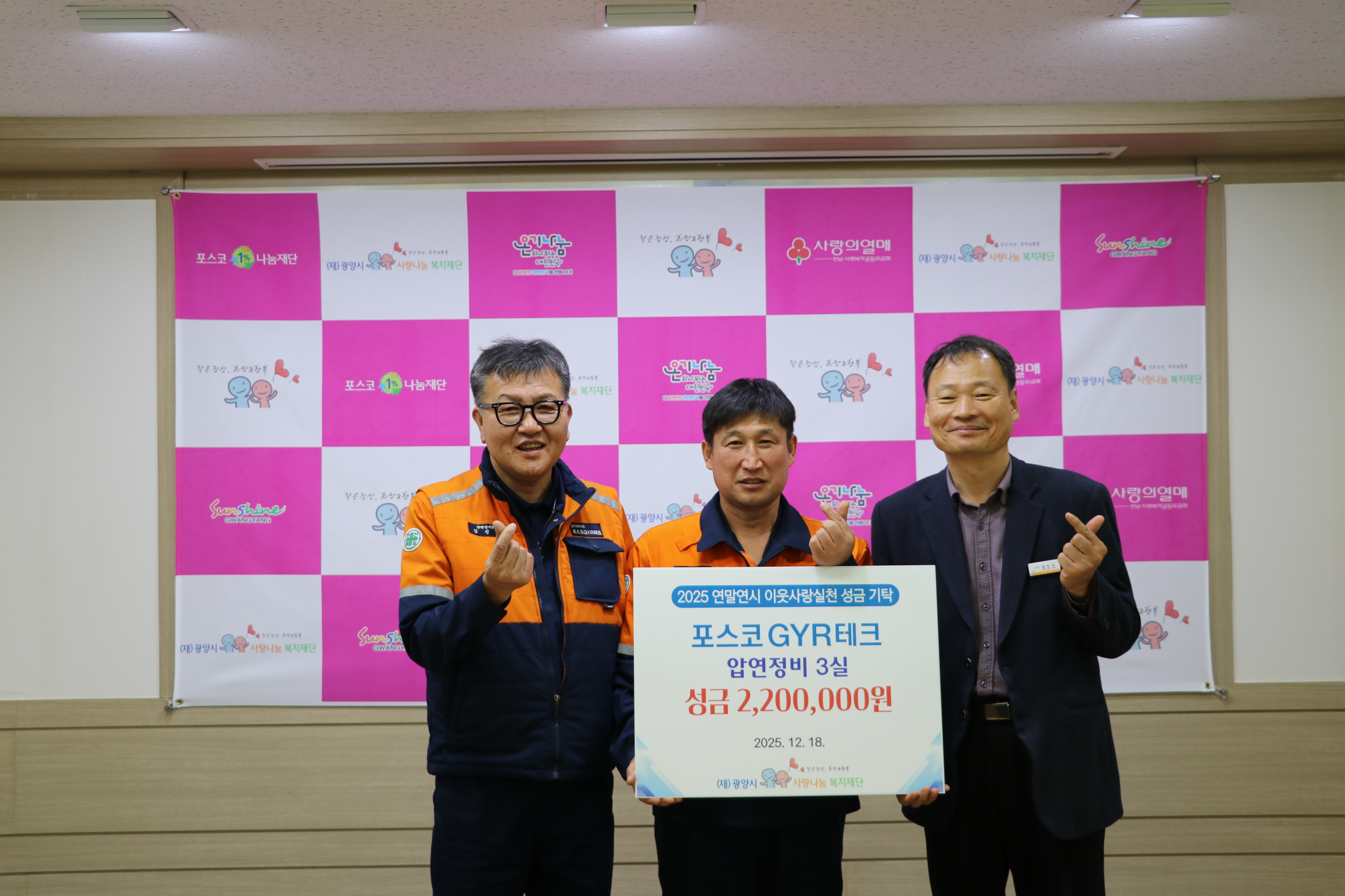 포스코GYR테크(대표이사 정훤우) 압연정비3실은 지난 18일(목) 복지재단에서 지역사회를 위한 나눔실천의 일환으로 광양시사랑나눔복지재단에 성금 2,200,000원을 전달했다.